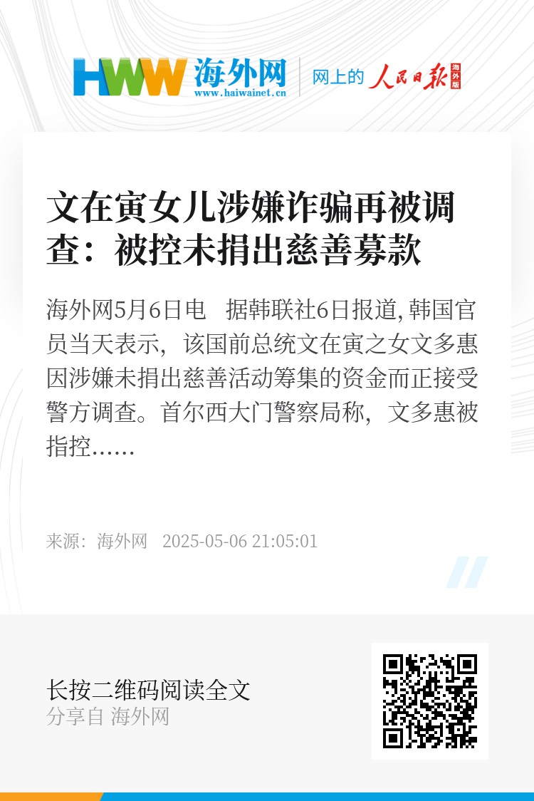 海外网5月6日电 据韩联社6日报道,韩国官员当天表示,该国前总统文在寅之女文多惠因涉嫌未捐出慈善活动筹集的资金而正接受警方调查。