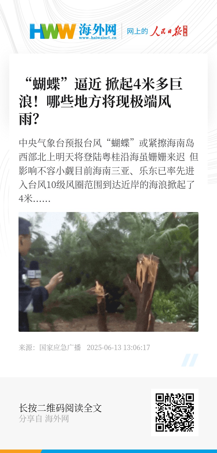 就台风“蝴蝶”而言,中央气象台首席预报员张玲提示,虽然强度不算特别强,但考虑其靠近我国陆地时移速较慢,给华南地区带来风雨影响的总体时间可能较长,加之季风水汽输送强度较强,需防范持续强降水引发城乡积涝、地质灾害风险以及中小河流洪水等次生灾害。