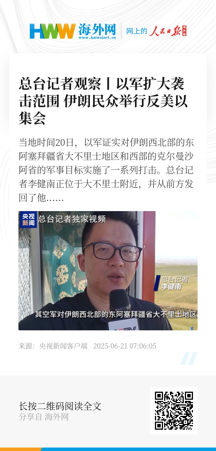 当地时间20日,以军证实对伊朗西北部的东阿塞拜疆省大不里士地区和西部的克尔曼沙阿省的军事目标实施了一系列打击。总台记者李健南正位于大不里士附近,并从前方发回了他最新的观察报道。