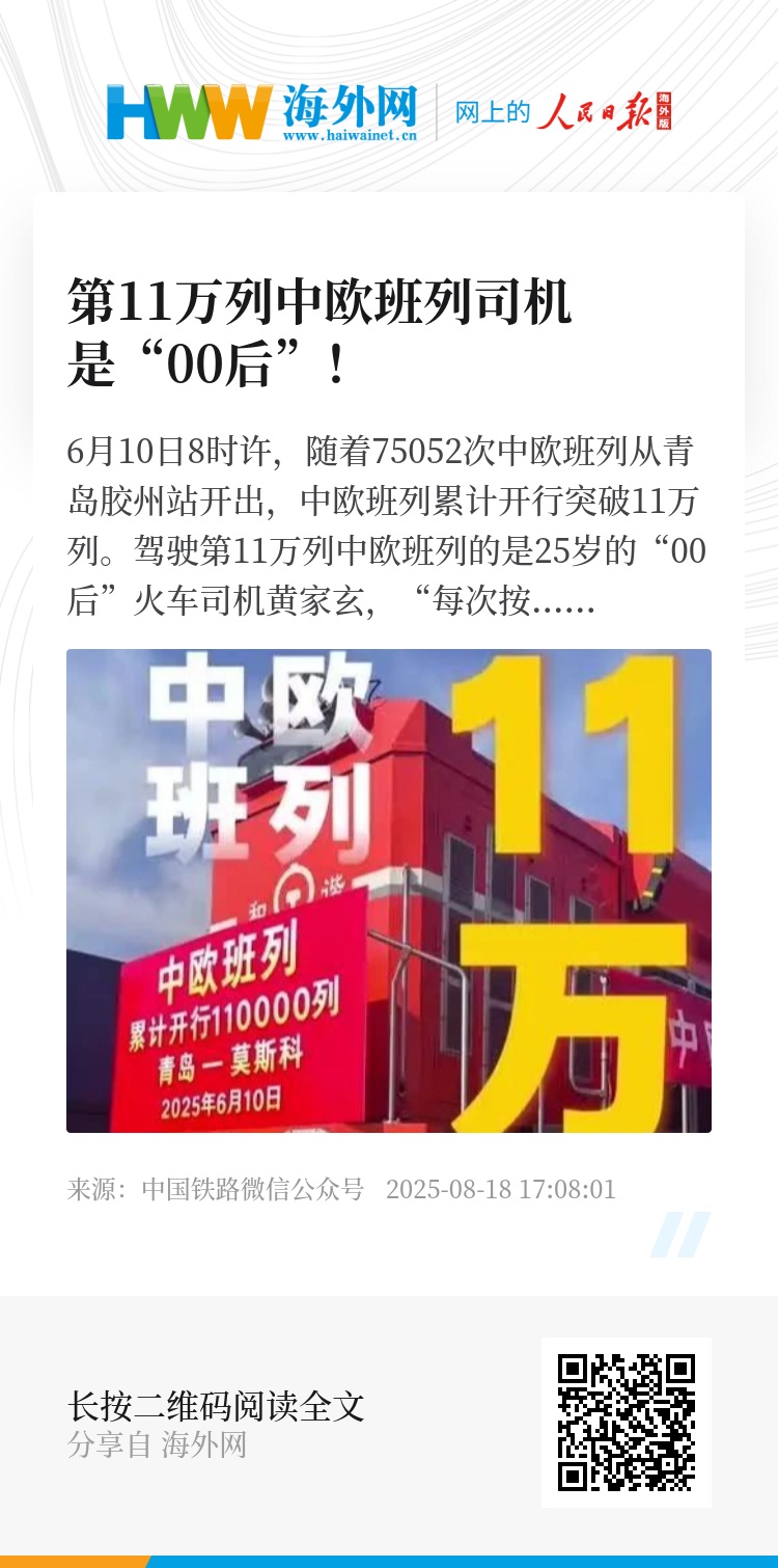 6月10日8时许,随着75052次中欧班列从青岛胶州站开出,中欧班列累计开行突破11万列。驾驶第11万列中欧班列的是25岁的“00后”火车司机黄家玄,“每次按下汽笛,那声响不只是火车的声音,更是跨越万里的问候。我坚信,在大陆的另一端,一定有人听到这声音,感受到我们传递的情谊。”