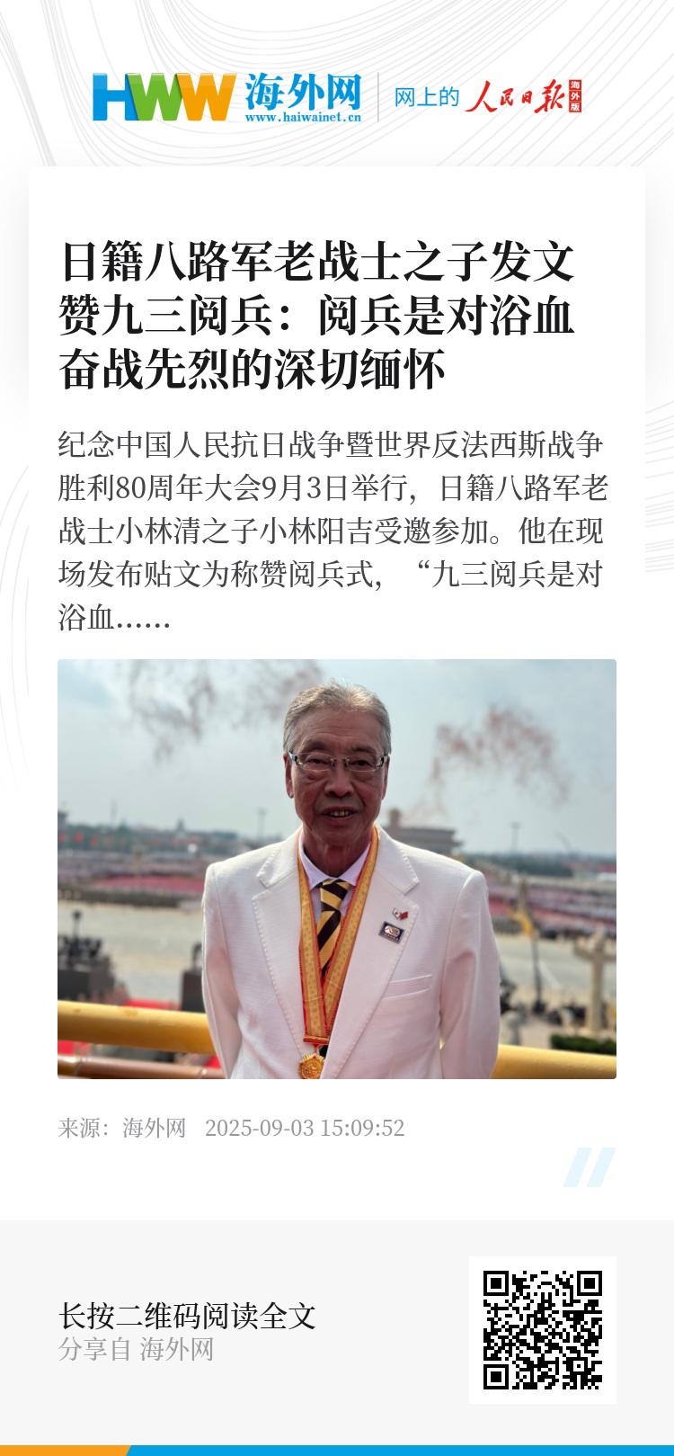 海外网9月3日电 纪念中国人民抗日战争暨世界反法西斯战争胜利80周年大会9月3日举行,日籍八路军老战士小林清之子小林阳吉受邀参加。他在现场发布贴文为称赞阅兵式,“九三阅兵是对浴血奋战先烈的深切缅怀,是对来之不易和平的郑重礼赞。”