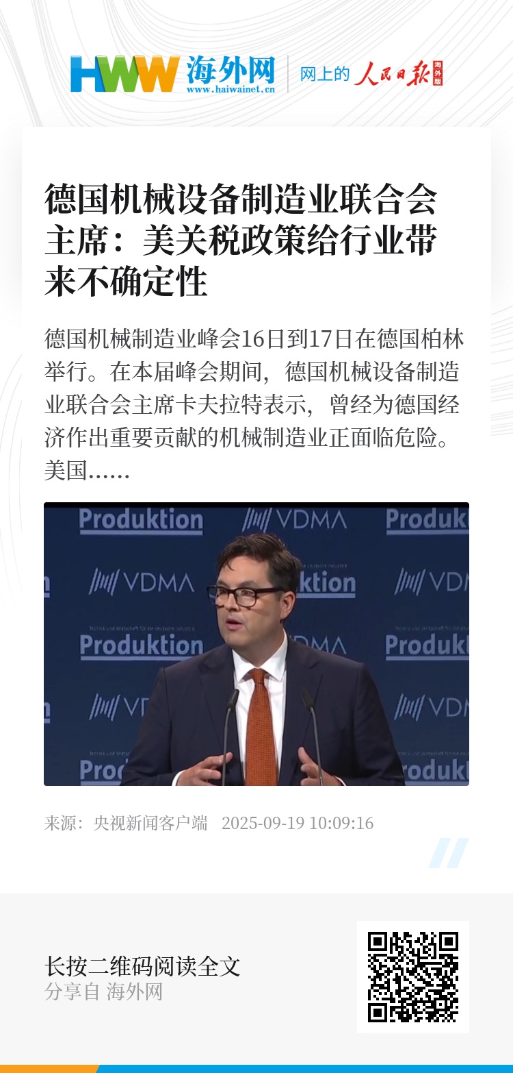 德国机械制造业峰会16日到17日在德国柏林举行。在本届峰会期间,德国机械设备制造业联合会主席卡夫拉特表示,曾经为德国经济作出重要贡献的机械制造业正面临危险。美国政府今年推出的关税政策给德国机械制造业带来了诸多不确定性。