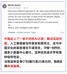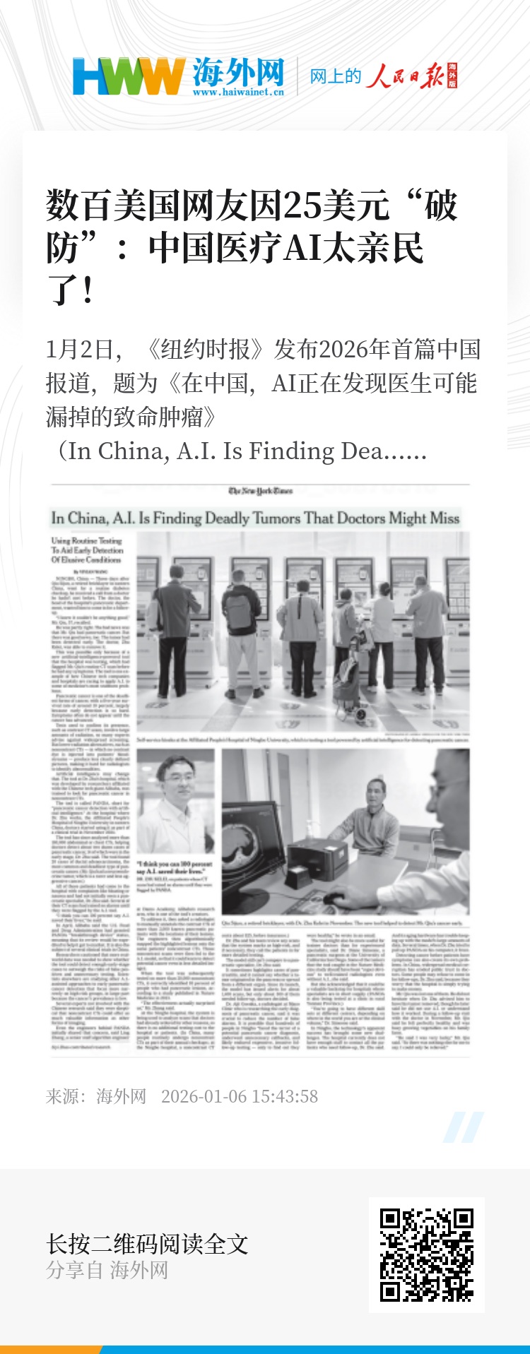 1月2日,《纽约时报》发布2026年首篇中国报道,题为《在中国,AI正在发现医生可能漏掉的致命肿瘤》(In China, A.I. Is Finding Deadly Tumors That Doctors Might Miss),整版讲述一个普通退休泥瓦匠的就医经历。凭借最新的中国AI技术,他仅花费了约25美元就查出了早期胰腺癌,令评论区里的美国网友集体“破防”,甚至有人感动得“热泪盈眶”。