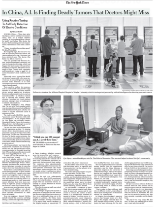 该院的朱柯磊医生对《纽约时报》说“我可以百分之百说,AI救了他们的命。”“他们都是因为肚子胀、恶心等症状来医院的,没有来看胰腺专科,CT片也没有显示异常,最后是AI报警了。”