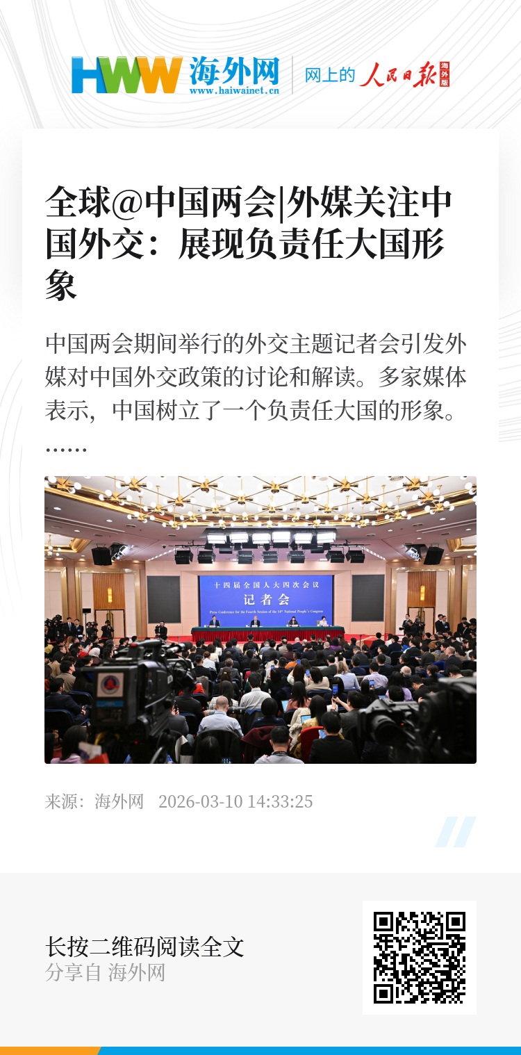 海外网3月10日电 中国两会期间举行的外交主题记者会引发外媒对中国外交政策的讨论和解读。多家媒体表示,中国树立了一个负责任大国的形象。