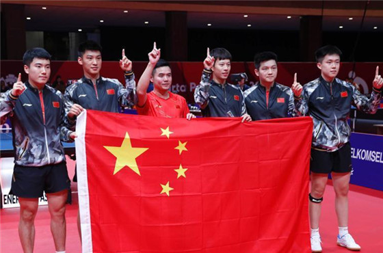 28日晚,中国乒乓球男队在雅加达亚运会乒乓球男团决赛中,以3:0横扫韩国队,实现亚运男团七连冠。