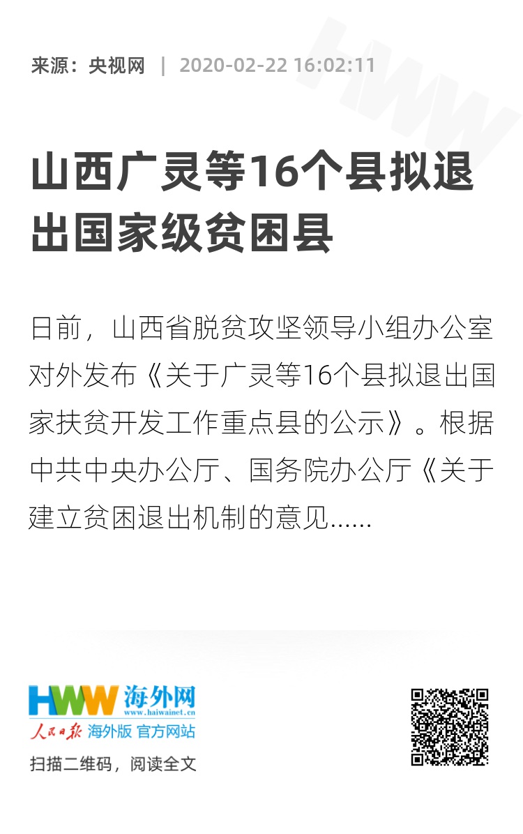 日前,山西省脱贫攻坚领导小组办公室对外发布《关于广灵等16个县拟退出国家扶贫开发工作重点县的公示》。