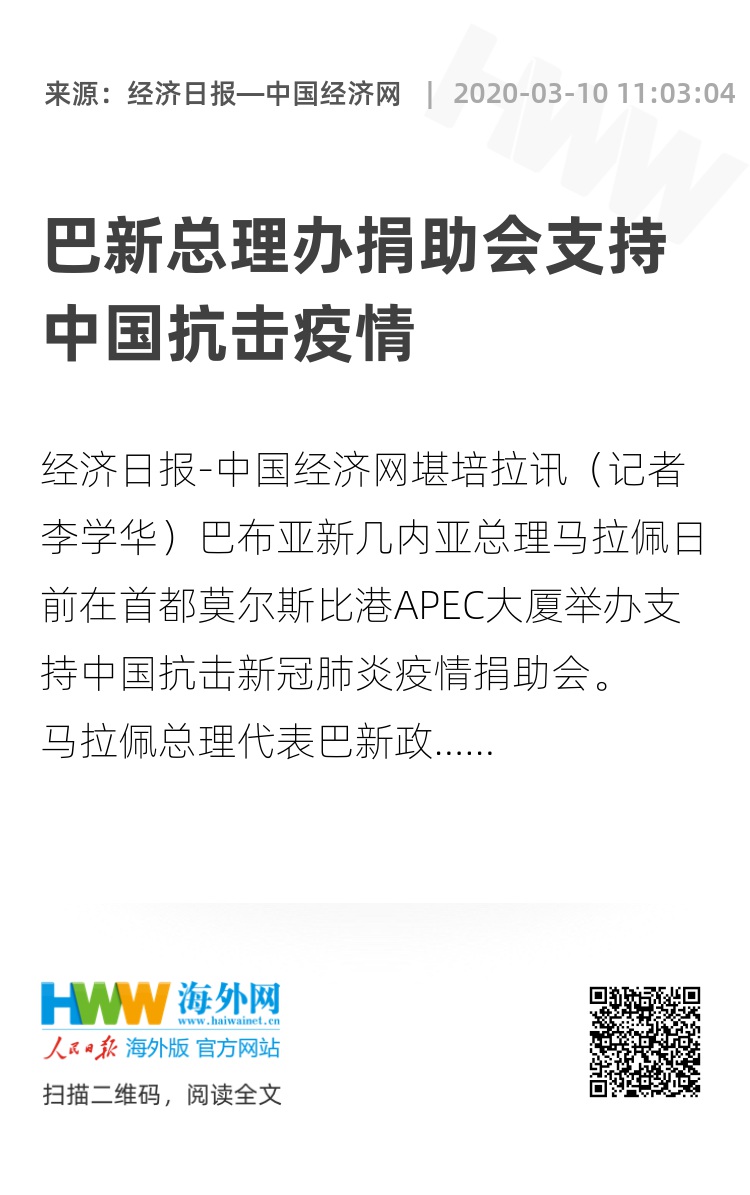 经济日报-中国经济网堪培拉讯(记者 李学华)巴布亚新几内亚总理马拉佩日前在首都莫尔斯比港APEC大厦举办支持中国抗击新冠肺炎疫情捐助会。