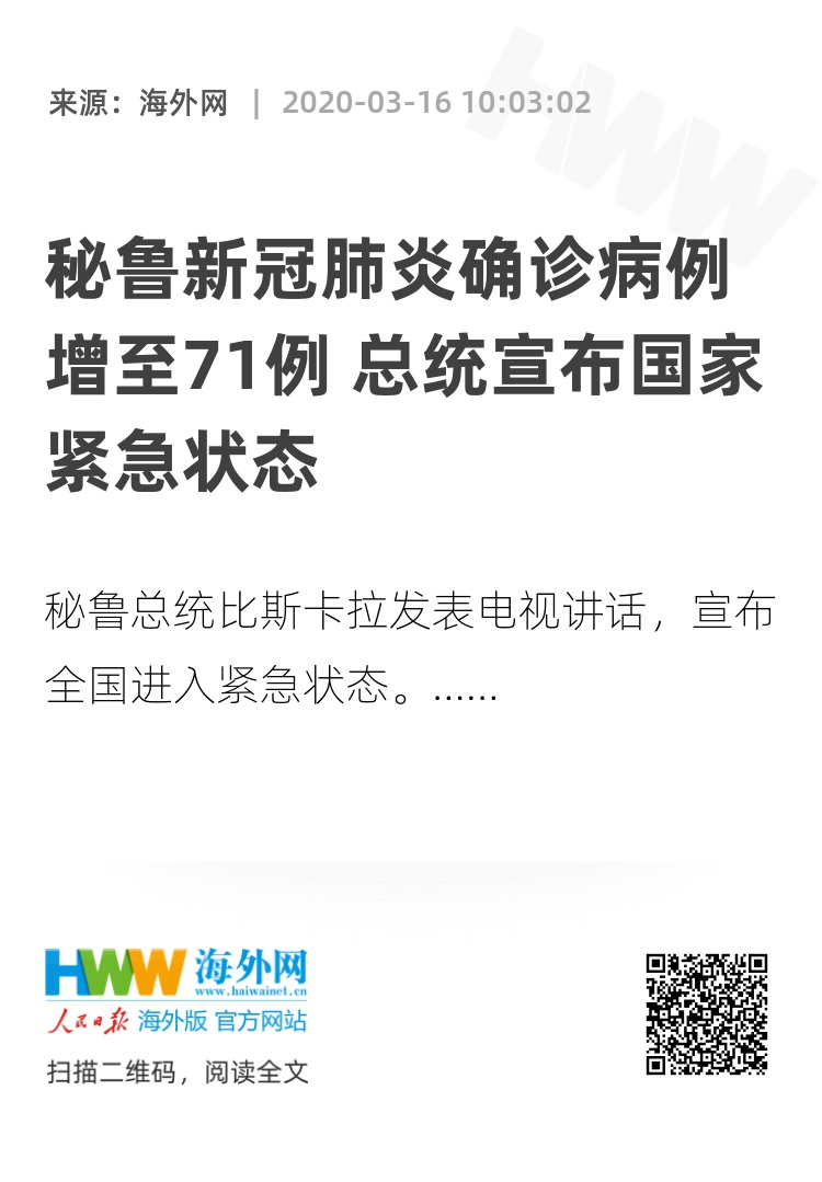 【海外网3月16日|战疫全时区】当地时间15下午,秘鲁总统比斯卡拉发表电视讲话,宣布全国进入紧急状态,为期15天,并关闭所有边境。