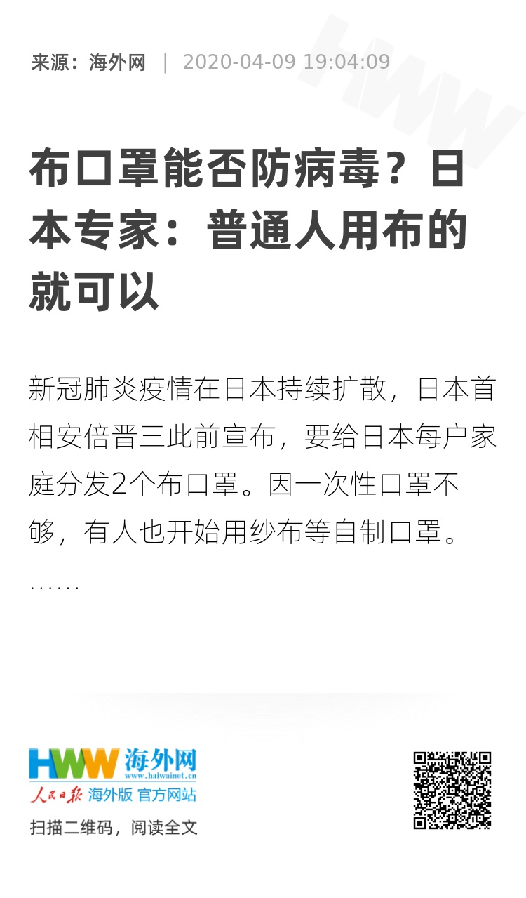 【海外网4月9日|战疫全时区】新冠肺炎疫情在日本持续扩散,日本首相安倍晋三此前宣布,要给日本每户家庭分发2个布口罩。因一次性口罩不够,有人也开始用纱布等自制口罩。但布质口罩究竟有没有预防感染的效果,许多日本人对此表示担忧和质疑。有专家出面解释称,哪种口罩都有预防效果,且一次性口罩需优先供给医务工作者,普通人用布口罩就可以。