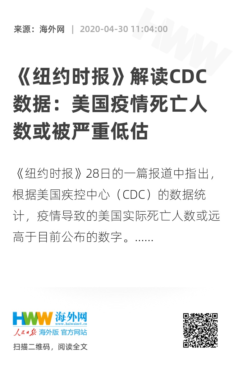 【海外网4月30日|战疫全时区】目前,美国新冠肺炎死亡病例已超过6万例。而《纽约时报》28日的一篇报道中却指出,根据美国疾控中心(CDC)的数据统计,疫情导致的实际死亡人数或远高于目前公布的数字。