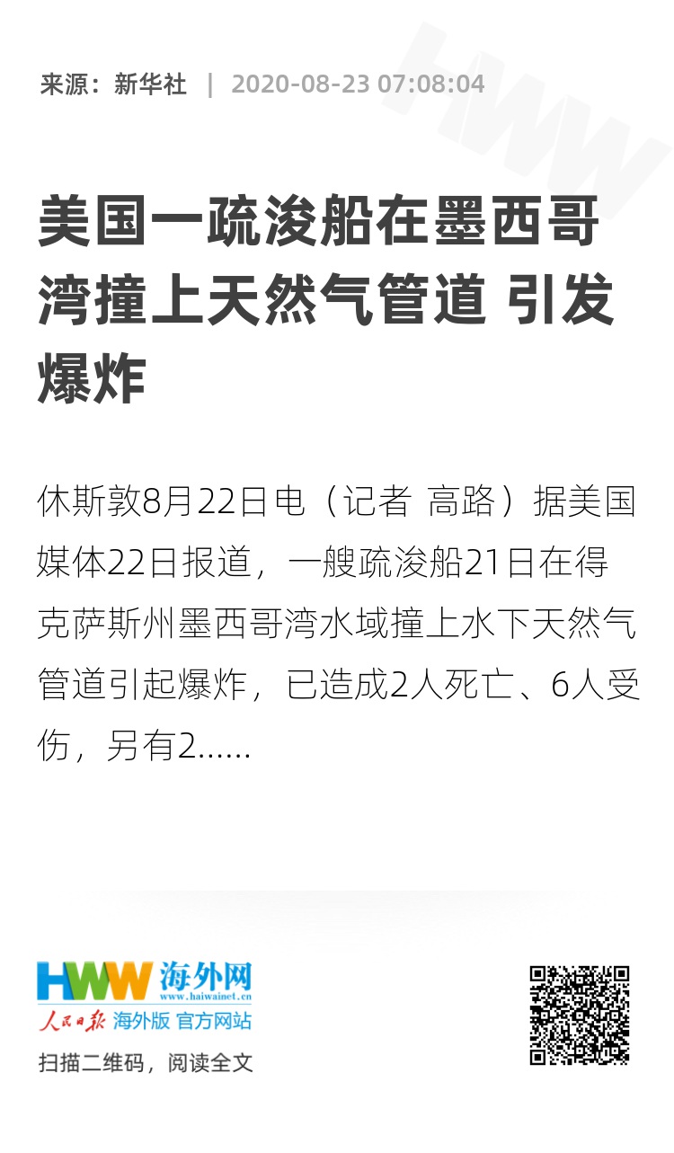 新华社休斯敦8月22日电(记者 高路)据美国媒体22日报道,一艘疏浚船21日在得克萨斯州墨西哥湾水域撞上水下天然气管道引起爆炸,已造成2人死亡、6人受伤,另有2人失踪。