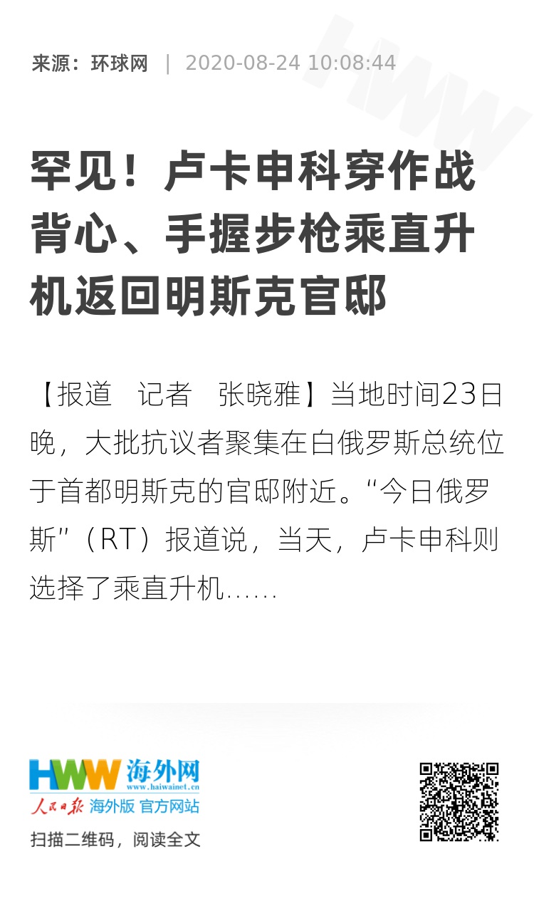 RT说,就在抗议爆发过程中,一架直升机从抗议者头顶飞过。“一些人在社交媒体上声称是卢卡申科在逃离这座城市,但现在看来,情况恰好相反。”