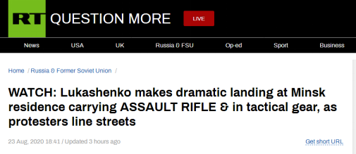 RT:抗议者聚集在街头时,卢卡申科带着突击步枪和战术装备戏剧性地空降在明斯克官邸处
