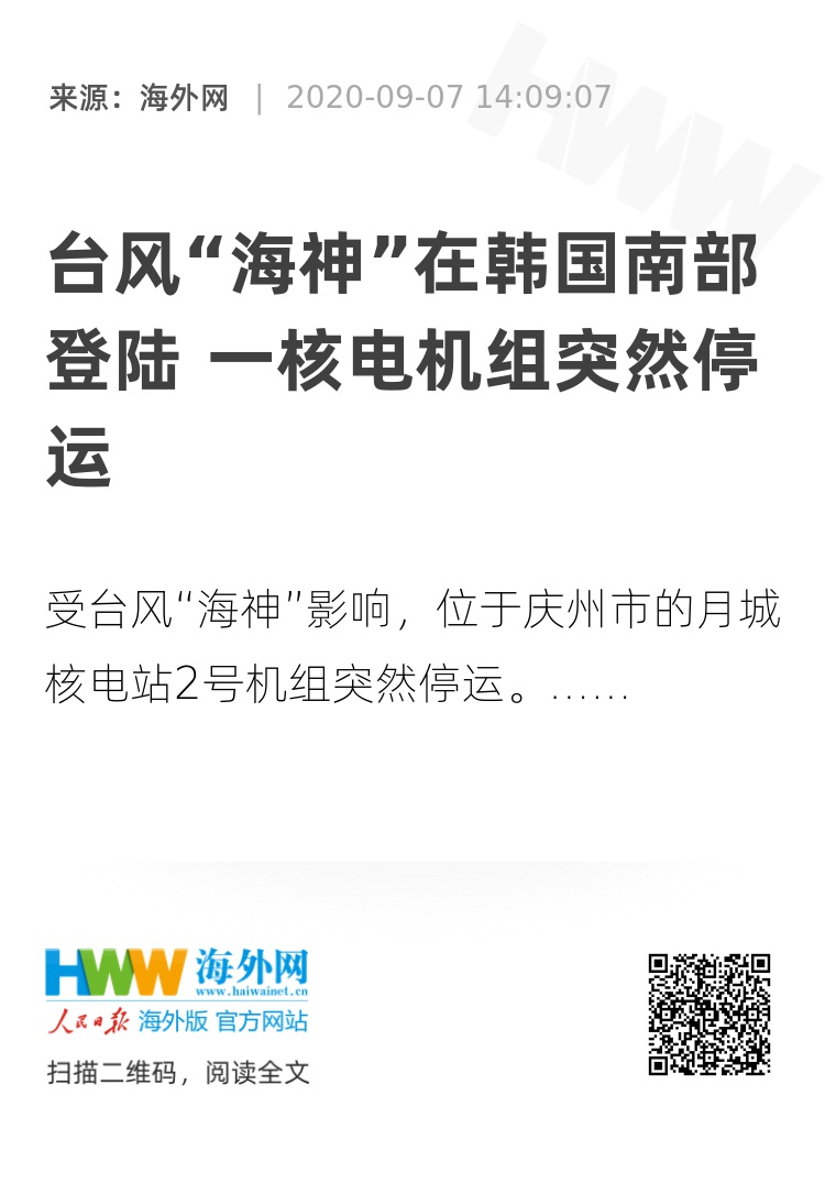 海外网9月7日电 韩国气象厅7日表示,当地时间上午9时左右,今年第10号台风“海神”蔚山市南部海岸登陆,受台风影响,位于庆州市的月城核电站的2号机组9时左右突然停运,具体原因仍在调查中。