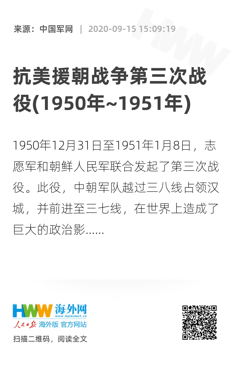 1950年12月31日至1951年1月8日,志愿军和朝鲜人民军联合发起了第三次战役。此役,中朝军队越过三八线占领汉城,并前进至三七线,在世界上造成了巨大的政治影响。
