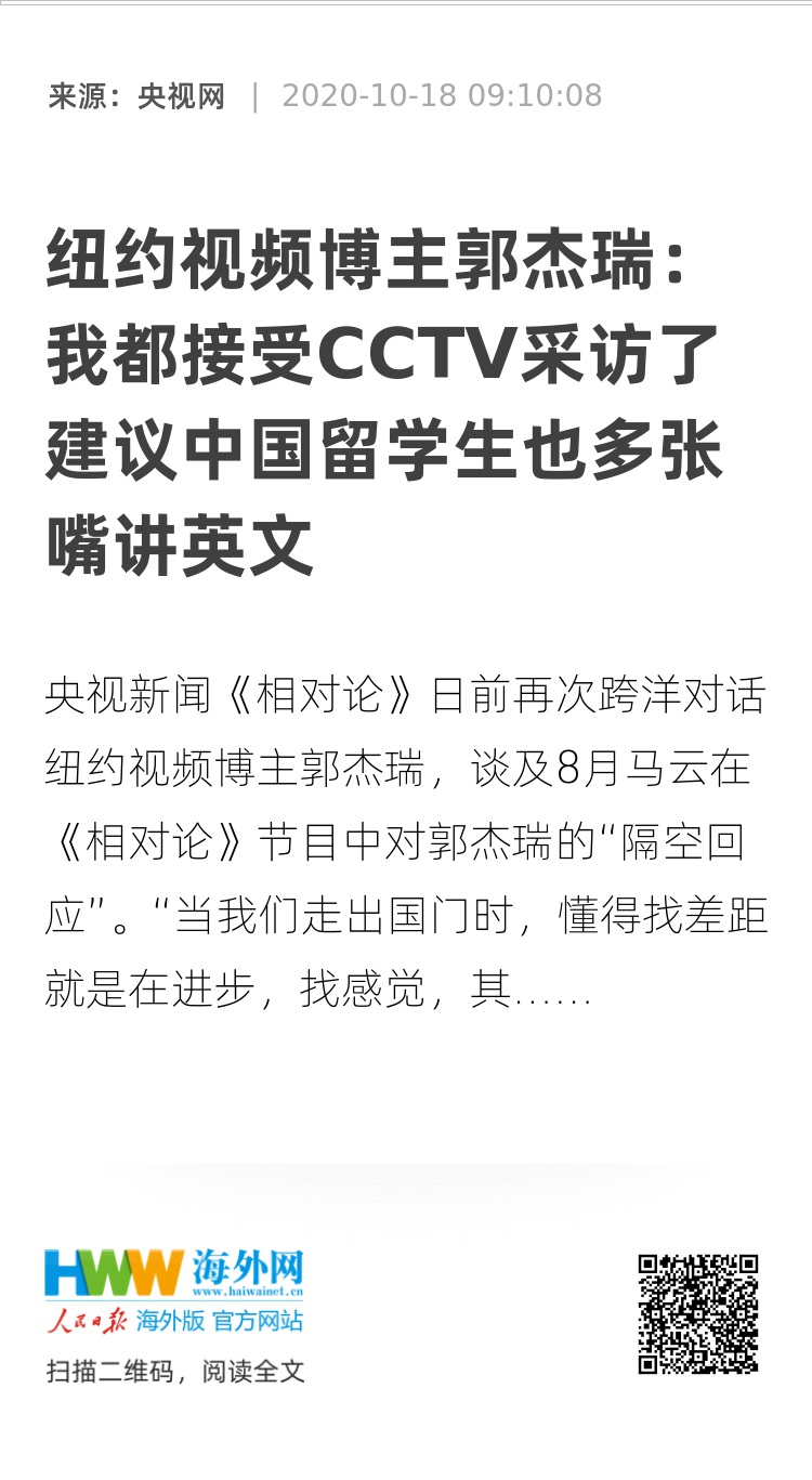 央视新闻《相对论》日前再次跨洋对话纽约视频博主郭杰瑞,谈及8月马云在《相对论》节目中对郭杰瑞的“隔空回应”。
