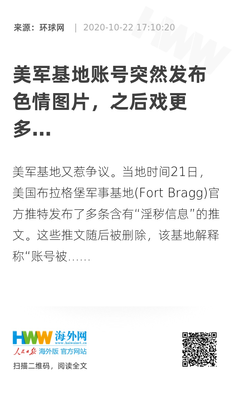 美军基地又惹争议。当地时间21日,美国布拉格堡军事基地(Fort Bragg)官方推特发布了多条含有“淫秽信息”的推文。这些推文随后被删除,该基地解释称“账号被黑客攻击”。然而,网友对此并不买账,有人讽刺称“可能是基地工作人员忘记切换账号了”,值得注意的是,RT称,布拉格堡军事基地当天已将该推特账号注销。目前,其推特主页显示“该账户不存在”。
