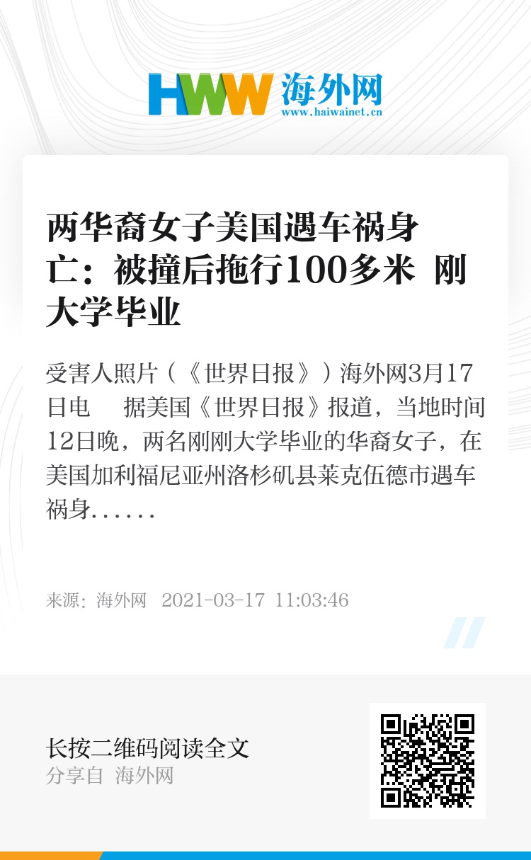 海外网3月17日电 据美国《世界日报》报道,当地时间12日晚,两名刚刚大学毕业的华裔女子,在美国加利福尼亚州洛杉矶县莱克伍德市遇车祸身亡。受害者在中国大陆的父母正赶往美国处理后事,亲友怀疑与歧视亚裔仇恨犯罪有关,但未获警方证实。