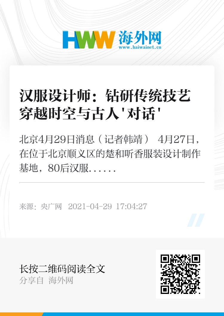 央广网北京4月29日消息(记者韩靖) 4月27日,在位于北京顺义区的楚和听香服装设计制作基地,80后汉服设计师朱珠正在手绘设计图,窗外的风景和室内华美的汉服元素融为一体,处处体现着传统文化的魅力。“这里如世外桃源般的创作环境,也契合了汉服设计制作的心境。”朱珠对记者说。