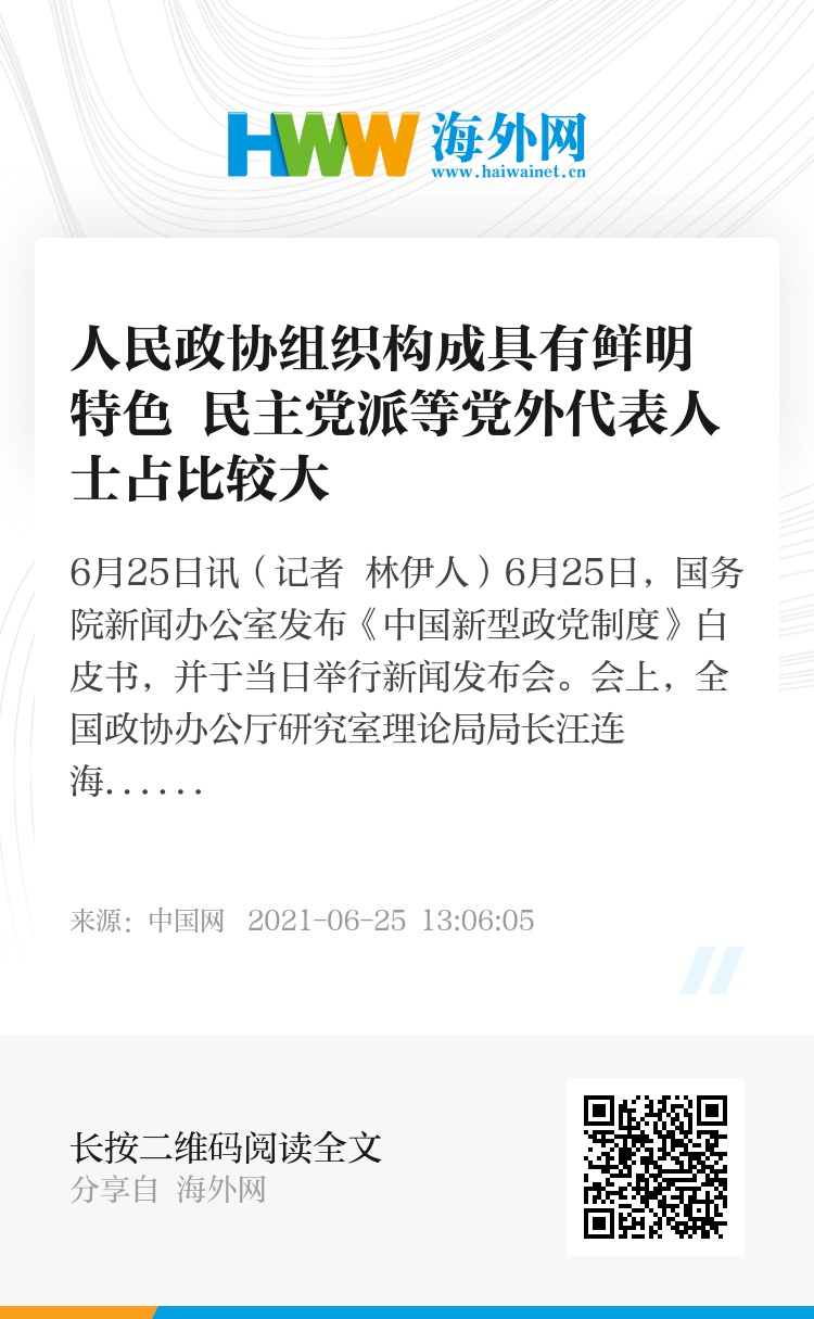 中国网6月25日讯(记者 林伊人)6月25日,国务院新闻办公室发布《中国新型政党制度》白皮书,并于当日举行新闻发布会。会上,全国政协办公厅研究室理论局局长汪连海就人民政协的组织构成进行介绍。