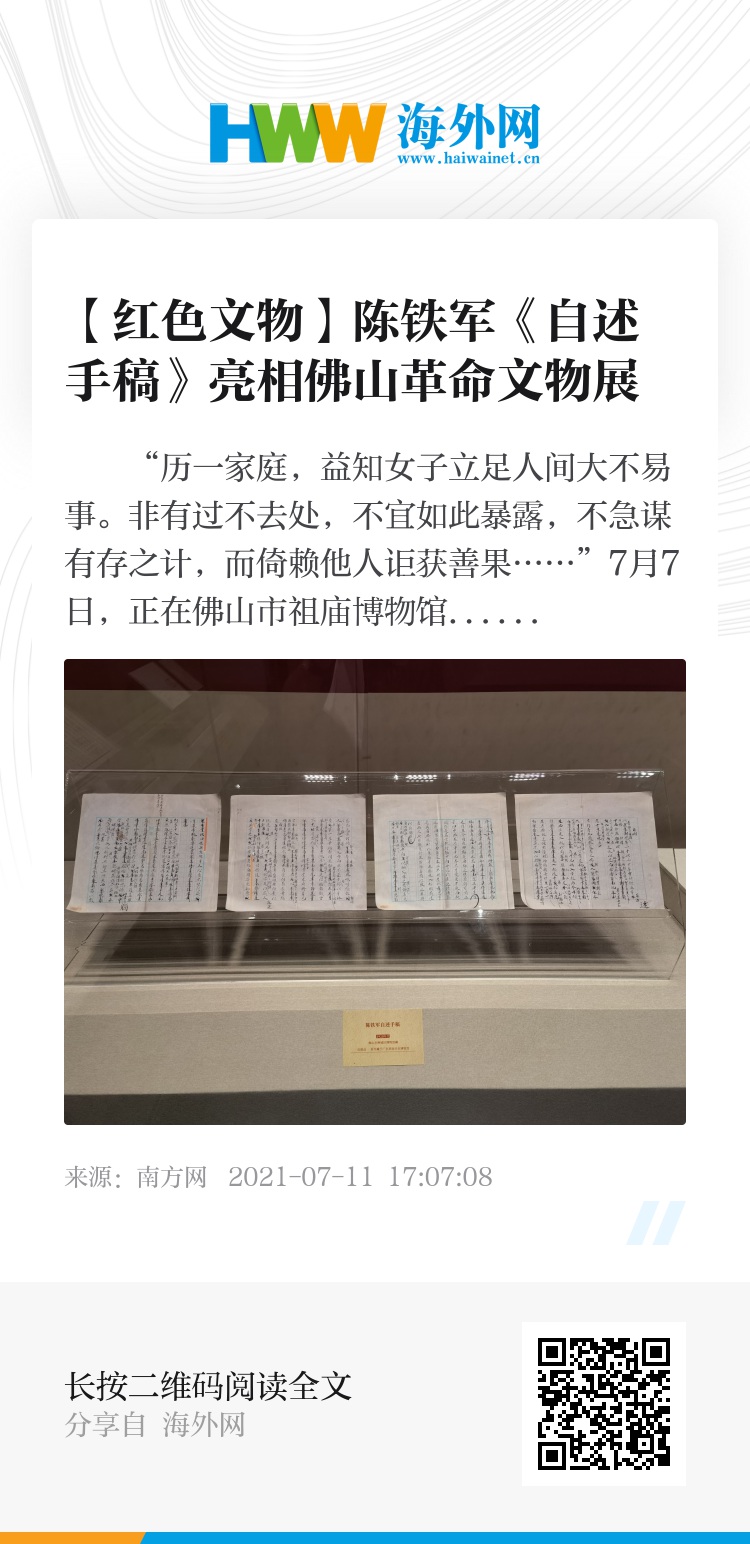 “历一家庭,益知女子立足人间大不易事。非有过不去处,不宜如此暴露,不急谋有存之计,而倚赖他人讵获善果……”7月7日,正在佛山市祖庙博物馆展出的“看万山红遍——佛山革命文物展”上,一份陈铁军亲笔书写的手稿透露其二十年的人生经历,令不少观者心绪久久不能平复。