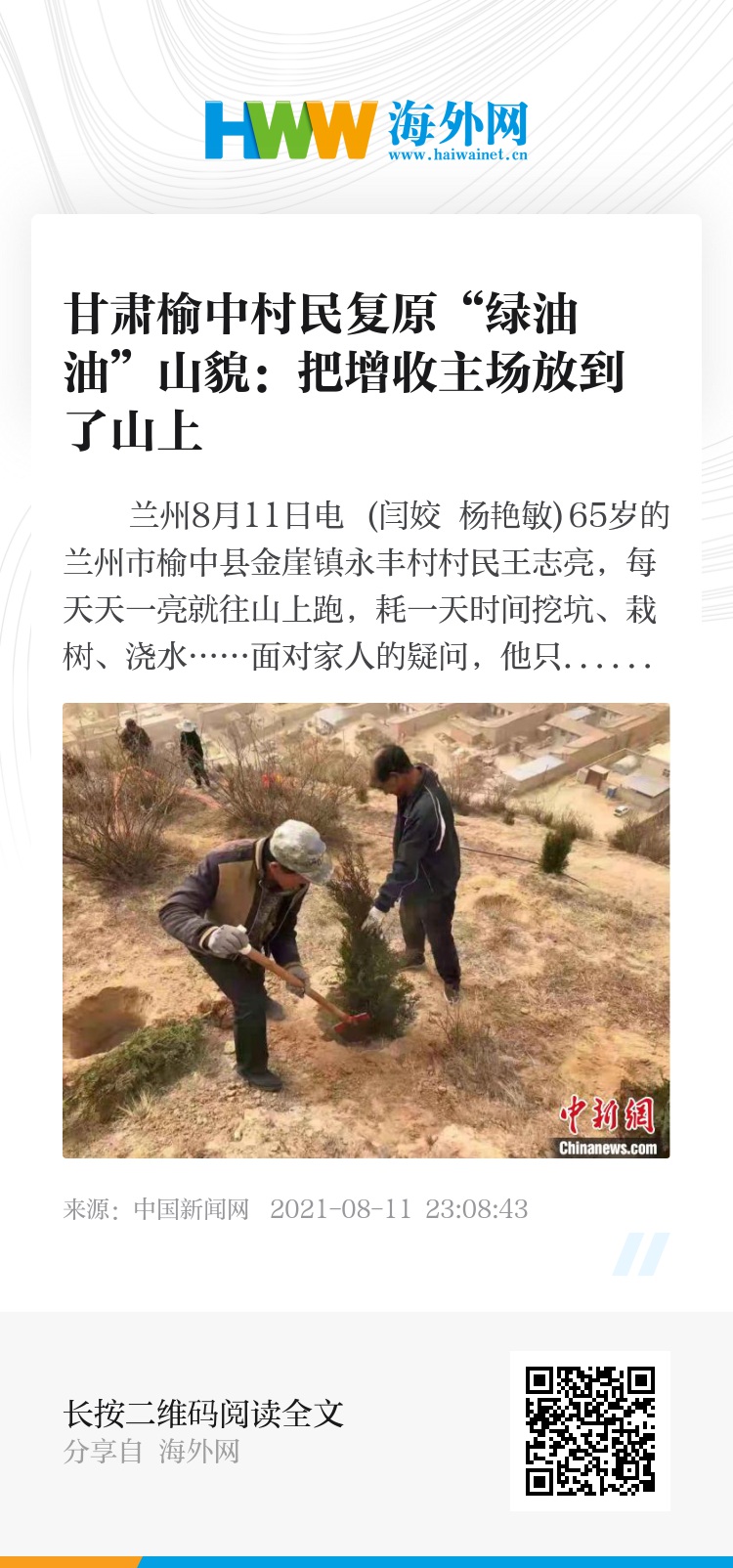 中新网兰州8月11日电 (闫姣 杨艳敏)65岁的兰州市榆中县金崖镇永丰村村民王志亮,每天天一亮就往山上跑,耗一天时间挖坑、栽树、浇水……面对家人的疑问,他只说,“绿化了山,对后人们好,以后可以发展旅游,借山增收。”
