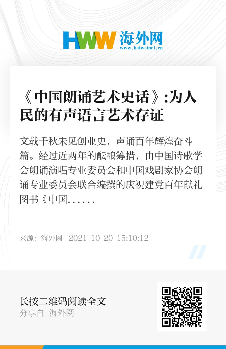 这种语言艺术形式,又以她独有的艺术表现力,在中国共产党百年的奋斗史中,发挥了革命文化的号角作用,成为中国革命文化的重要内容。把朗诵艺术在党的百年奋斗史中的作用和发展发掘并记录下来,既可以从一个侧面学习了解党史知识,也可以从文化和政治的角度去认识朗诵艺术在中国革命和建设中的特殊作用,从而更好地继承和发扬中华优秀传统文化和革命文化的精神和基因。在这方面,《中国朗诵艺术史话》作出了积极有益的探索。(安然)