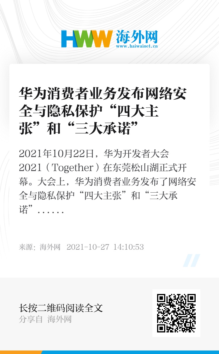 2021年10月22日,华为开发者大会2021(Together)在东莞松山湖正式开幕。大会上,华为消费者业务发布了网络安全与隐私保护“四大主张”和“三大承诺”,以此来共建安全可信的数字世界。华为消费者业务首席运营官何刚提到:“在广大开发者和伙伴们的共同努力下,基于HarmonyOS的全新生态已初步成型,一个繁荣的鸿蒙生态距离我们并不遥远。”