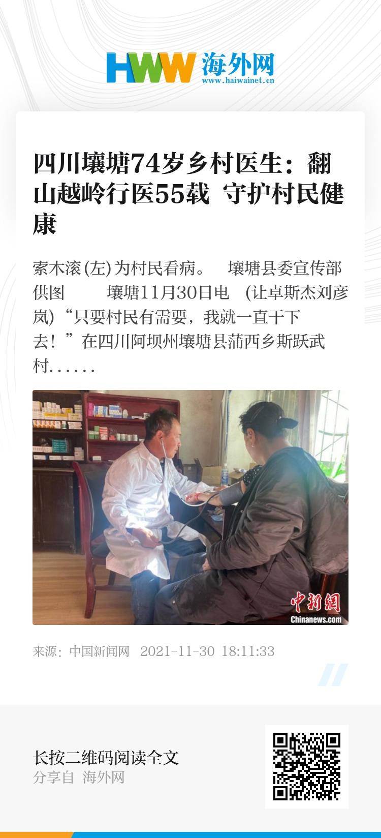 中新网壤塘11月30日电 (让卓斯杰刘彦岚)“只要村民有需要,我就一直干下去!”在四川阿坝州壤塘县蒲西乡斯跃武村,今年74岁的乡村医生索木滚在这里一待就是一辈子;19岁走村入寨为村民看病,这一行一干就是55年。从少年到白头,从风华正茂到风烛残年,索木滚因行走高原翻山越岭为牧民问诊,膝盖早已落下严重病根,可他拄着拐杖依然坚守在乡村从医路上。