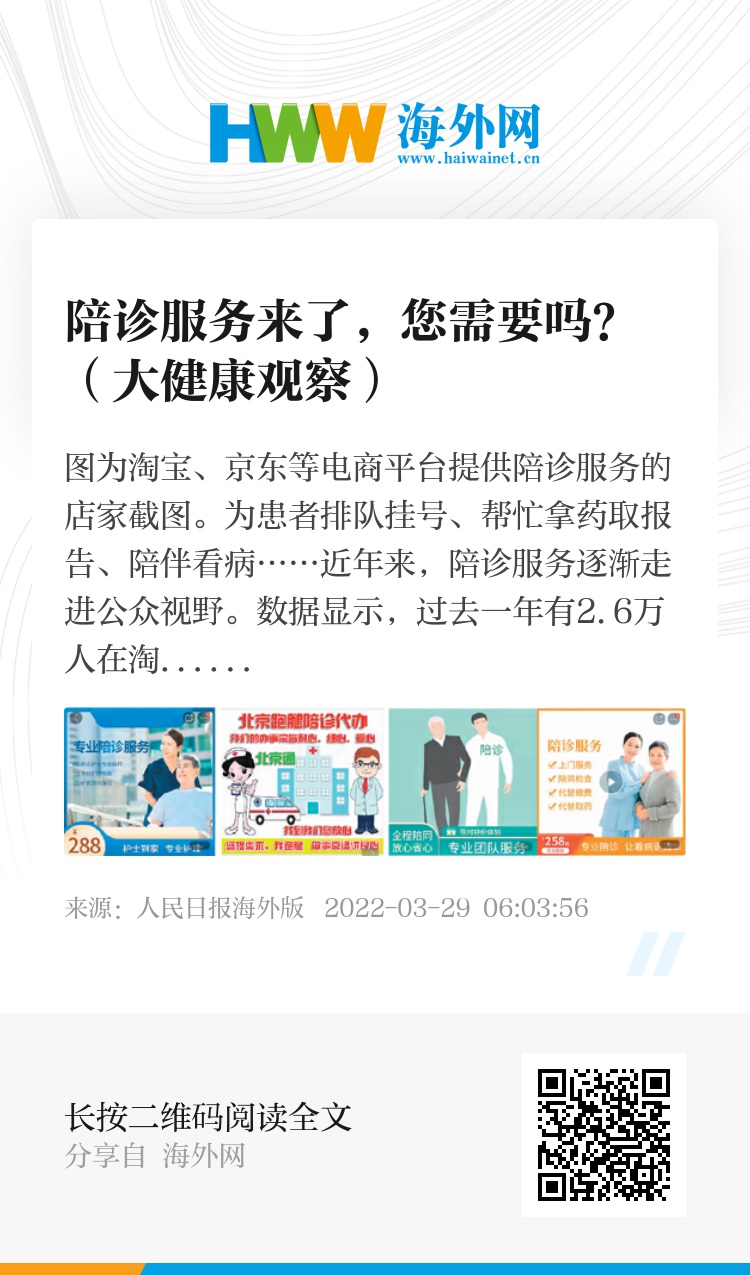 为患者排队挂号、帮忙拿药取报告、陪伴看病……近年来,陪诊服务逐渐走进公众视野。数据显示,过去一年有2.6万人在淘宝搜索“陪诊”。据不完全统计,淘宝、京东等电商平台上提供陪诊服务的店铺超过500家,生意好的店铺月销达上千单。