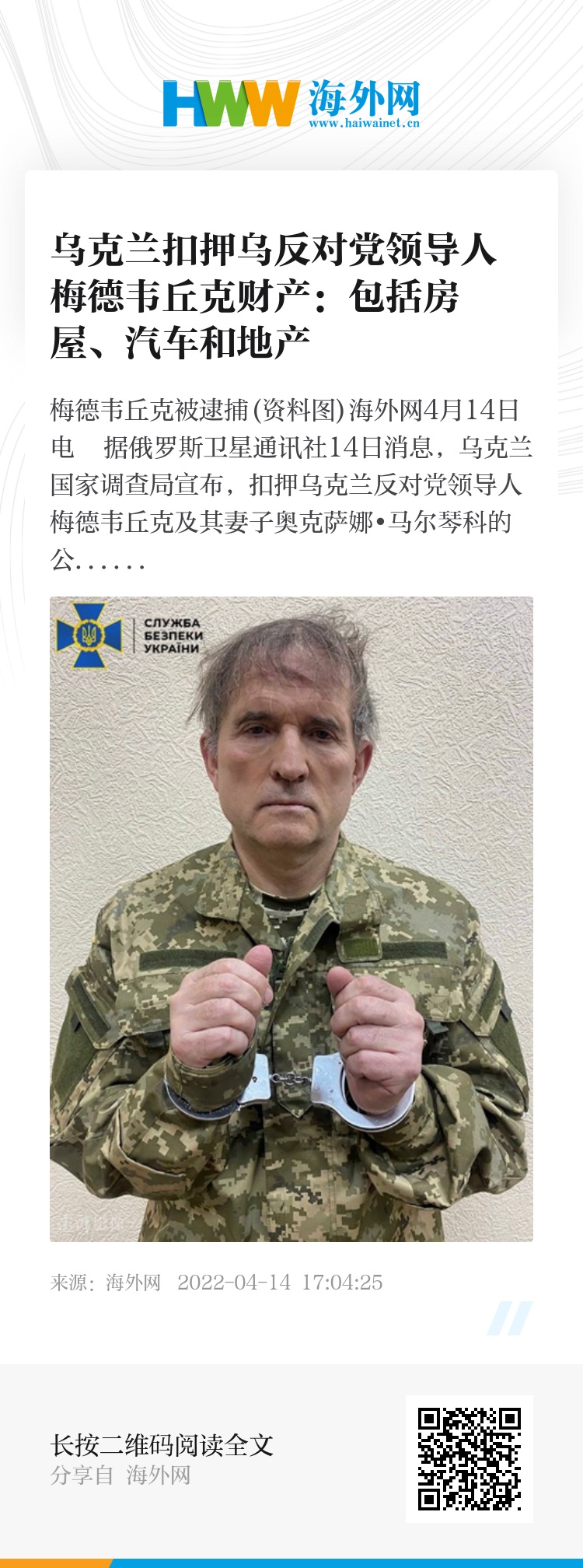 据报道,梅德韦丘克是乌最富有的人之一,也是反对党领导人,一直被视为俄领导人在乌“最亲密盟友”。他于2021年5月被逮捕,罪名是“叛国”,一直被软禁在家中,但在今年俄乌冲突爆发后不久失踪。(海外网-王珊宁)