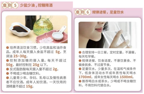 《中国居民膳食指南(2022)》提炼出了平衡膳食八准则:一、食物多样,合理搭配;二、吃动平衡,健康体重;三、多吃蔬果、奶类、全谷、大豆;四、适量吃鱼、禽、蛋、瘦肉;五、少盐少油,控糖限酒;六、规律进餐,足量饮水;七、会烹会选,会看标签;八、公筷分餐,杜绝浪费。其中,新增“会烹会选,会看标签”与“规律进餐,足量饮水”等,而“控糖”作为之前强调的平衡膳食准则不仅被保留下来,更在八大基本准则中有了更进一步的阐述、指导。