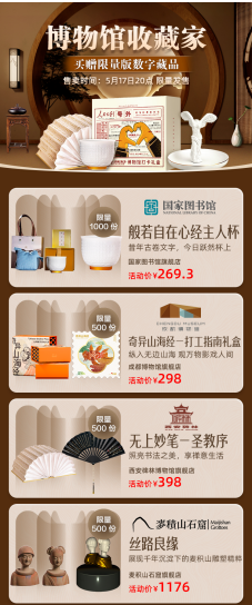 记者了解到,此次共有国家图书馆、敦煌研究院、西安碑林博物馆、麦积山石窟、河南博物院、宫里的世界、国家大剧院、人民文学出版社·人文之宝、卢浮宫博物馆等10家博物馆、图书馆在其天猫旗舰店进行数字藏品的发行,首个中央媒体文创品牌“人民文创”也参与其中。