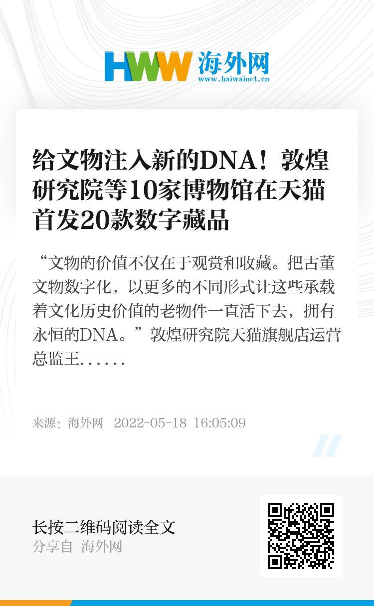 “文物的价值不仅在于观赏和收藏。把古董文物数字化,以更多的不同形式让这些承载着文化历史价值的老物件一直活下去,拥有永恒的DNA。”敦煌研究院天猫旗舰店运营总监王羽说。
