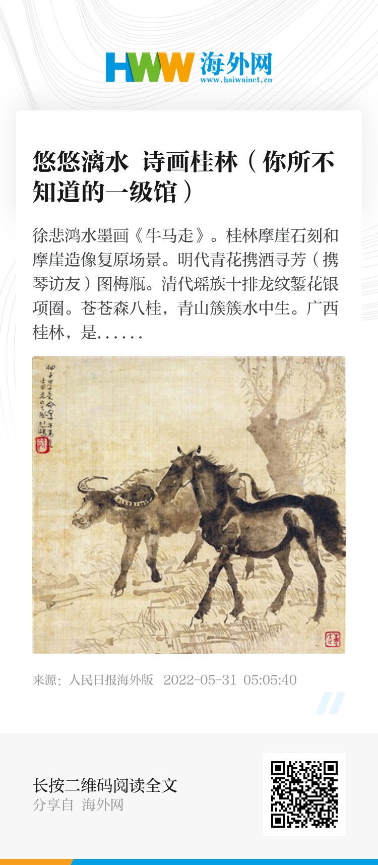“所学一以失,终身牛马走。”徐悲鸿的水墨画《牛马走》是桂林博物馆馆藏书画中的精品。徐悲鸿擅长画马,“九一八”事变后,徐悲鸿笔下的马常常寄托着忧国忧民之情和奋起抗争、不屈不挠的民族精神。从画作题字可知,《牛马走》是1932年徐悲鸿应好友杨仲子所求而作。杨仲子为音乐教育家,以此图表达自己为祖国的音乐事业奔走劬劳的拳拳之心。