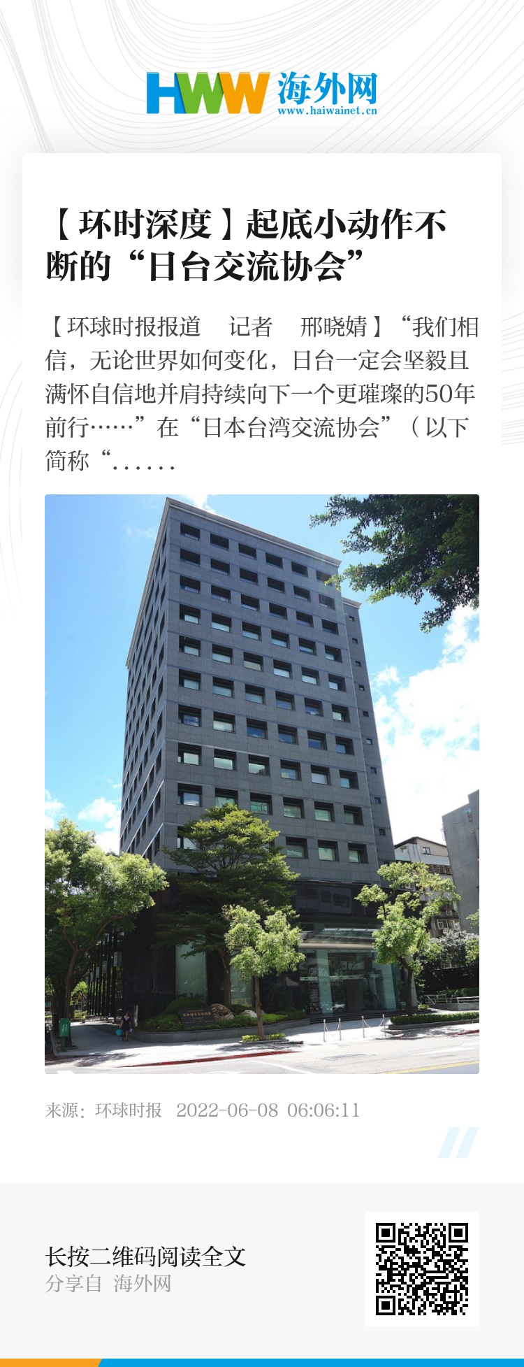 《环球时报》记者查询发现,“日台交流协会”在其官网上堂而皇之地宣称,在没有“外交关系”的台湾,开展类似于“驻外公馆”的业务。而在一些“台独”分子眼中,“日台交流协会”既是日台“官方”事务的沟通平台,又维持双方在经贸、技术等方面的交流合作,本质上相当于“大使馆”般的存在。