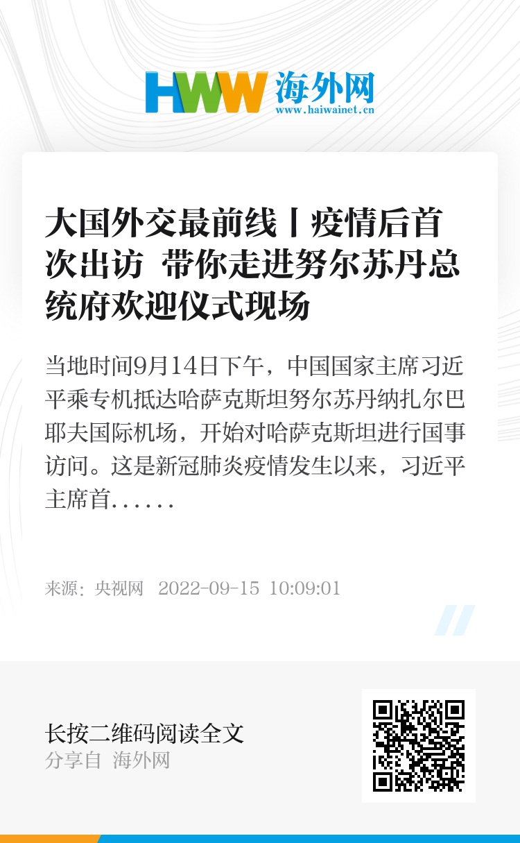 当地时间9月14日下午,中国国家主席习近平乘专机抵达哈萨克斯坦努尔苏丹纳扎尔巴耶夫国际机场,开始对哈萨克斯坦进行国事访问。这是新冠肺炎疫情发生以来,习近平主席首次出访,“大国外交最前线”带您前往努尔苏丹总统府!