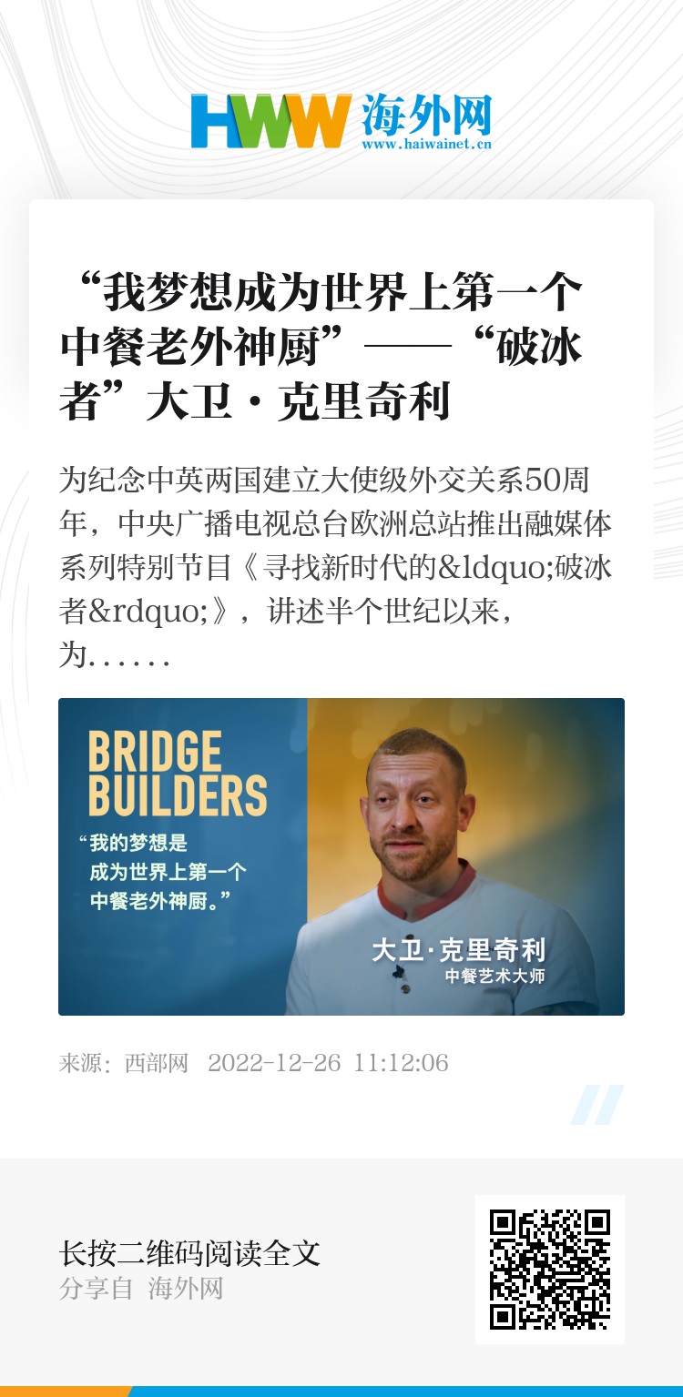 为纪念中英两国建立大使级外交关系50周年,中央广播电视总台欧洲总站推出融媒体系列特别节目《寻找新时代的“破冰者”》,讲述半个世纪以来,为中英双边关系发展做出杰出贡献的人物故事。本期推出的是英国利物浦市中餐艺术大师大卫·克里奇利的故事。