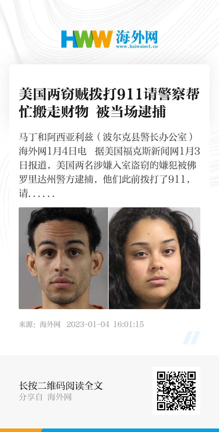 海外网1月4日电 据美国福克斯新闻网1月3日报道,美国两名涉嫌入室盗窃的嫌犯被佛罗里达州警方逮捕,他们此前拨打了911,请警察帮忙从房子里搬走财物。