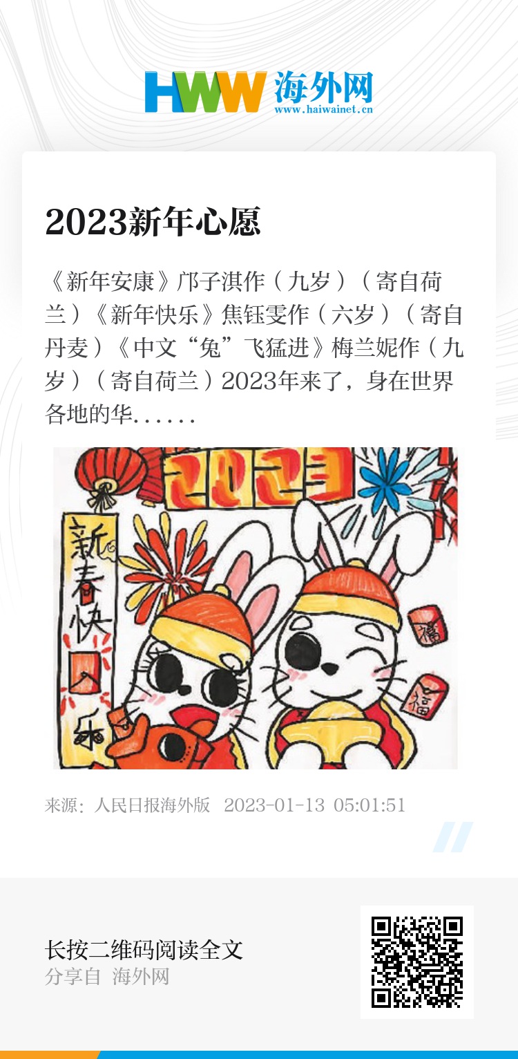 2023年来了,身在世界各地的华裔青少年用方块字和画笔描绘了自己的新年愿望。这些愿望中,有对亲人朋友的祝福,有对未来学业的规划,也有对世界和平的期许。正如一位在海外从事中文教学多年的老师所说:“孩子们朴实的语言展现出他们对社会和他人的关注,展现出他们的爱与善良,也展现了他们的中文学习成果,祝福他们有充满希望的未来。”