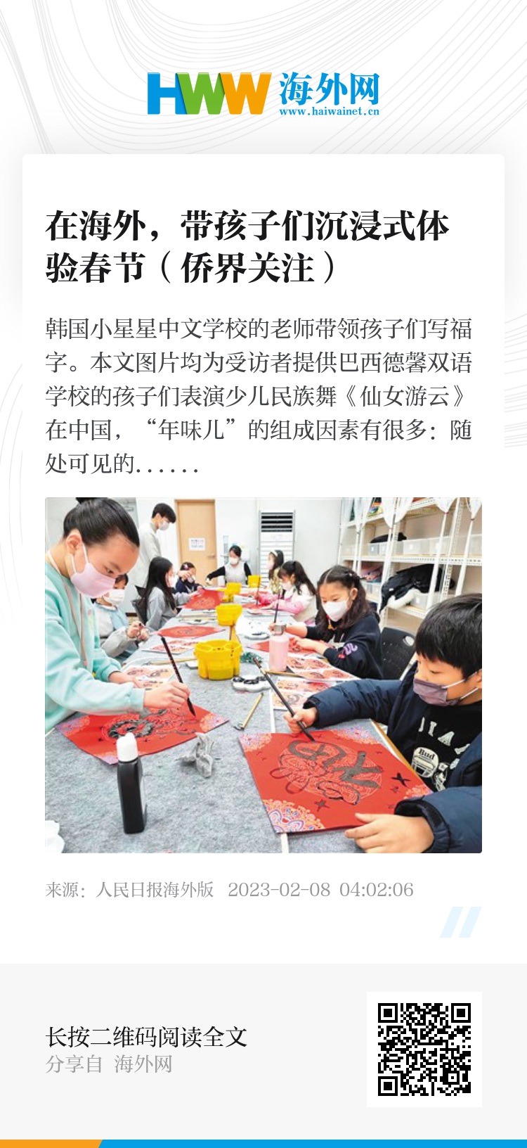 “润物细无声”,是海外华校老师向孩子们传输中华传统文化的生动写照。“在海外,年味儿不好找。希望能通过我们设计组织的各种活动,让孩子们沉浸式体验春节,潜移默化地让他们亲近我们的传统文化,在他们心中播下小小的种子,然后静待花开。”马菲说。