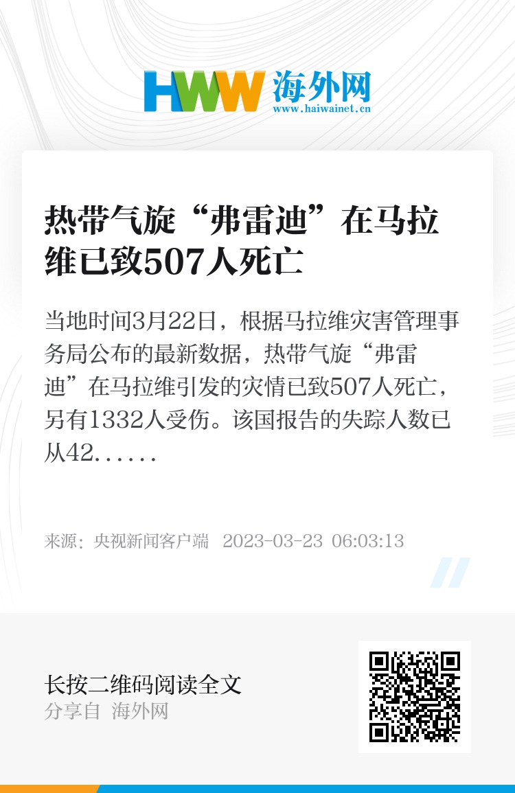 当地时间3月22日,根据马拉维灾害管理事务局公布的最新数据,热带气旋“弗雷迪”在马拉维引发的灾情已致507人死亡,另有1332人受伤。该国报告的失踪人数已从427人增加到537人。