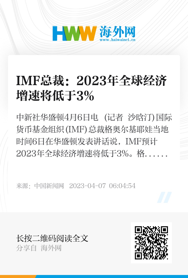 中新社华盛顿4月6日电 (记者 沙晗汀)国际货币基金组织(IMF)总裁格奥尔基耶娃当地时间6日在华盛顿发表讲话说,IMF预计2023年全球经济增速将低于3%。