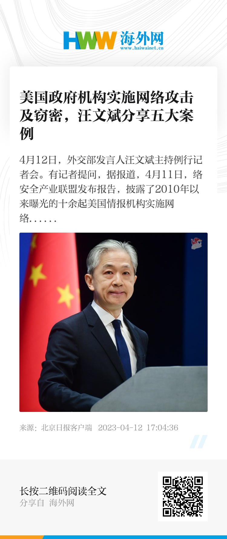 有记者提问,据报道,4月11日,中国网络安全产业联盟发布报告,披露了2010年以来曝光的十余起美国情报机构实施网络攻击、开展网络监控及窃密、泄露扩散网络攻击武器和工具的案例。请问中方对此有何评论?