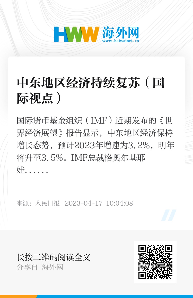 国际货币基金组织(IMF)近期发布的《世界经济展望》报告显示,中东地区经济保持增长态势,预计2023年增速为3.2%,明年将升至3.5%。IMF总裁格奥尔基耶娃表示,中东国家积极推进经济多元化,在吸引投资、鼓励创新、发展科技等领域开辟更广阔空间,在全球经济增长面临诸多不确定性因素时展现出较大韧性和潜力。