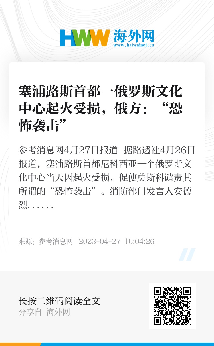参考消息网4月27日报道 据路透社4月26日报道,塞浦路斯首都尼科西亚一个俄罗斯文化中心当天因起火受损,促使莫斯科谴责其所谓的“恐怖袭击”。