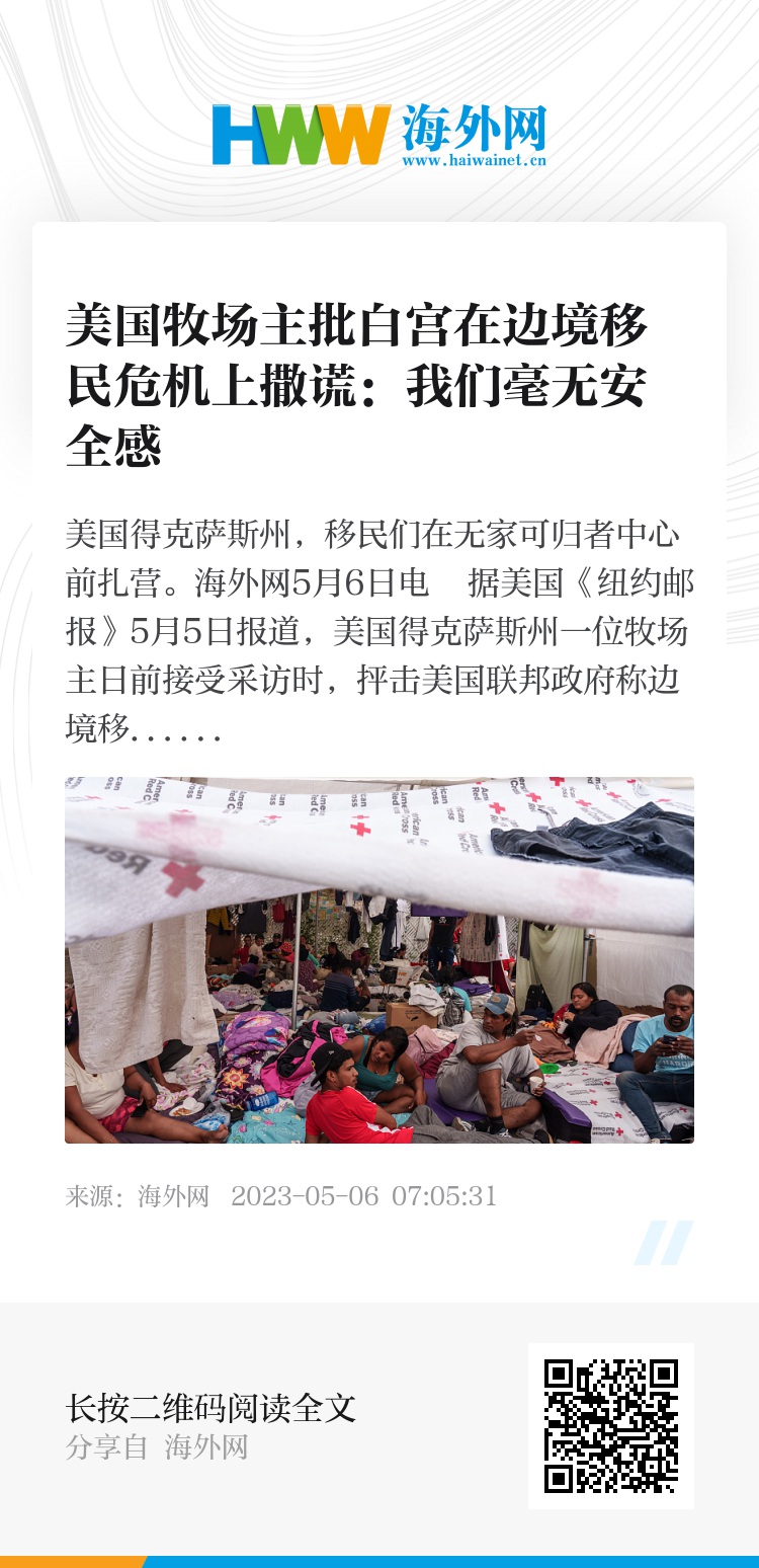 海外网5月6日电 据美国《纽约邮报》5月5日报道,美国得克萨斯州一位牧场主日前接受采访时,抨击美国联邦政府称边境移民危机有所改善是谎言。她表示,实际情况是一天比一天糟糕,当地人毫无安全感。