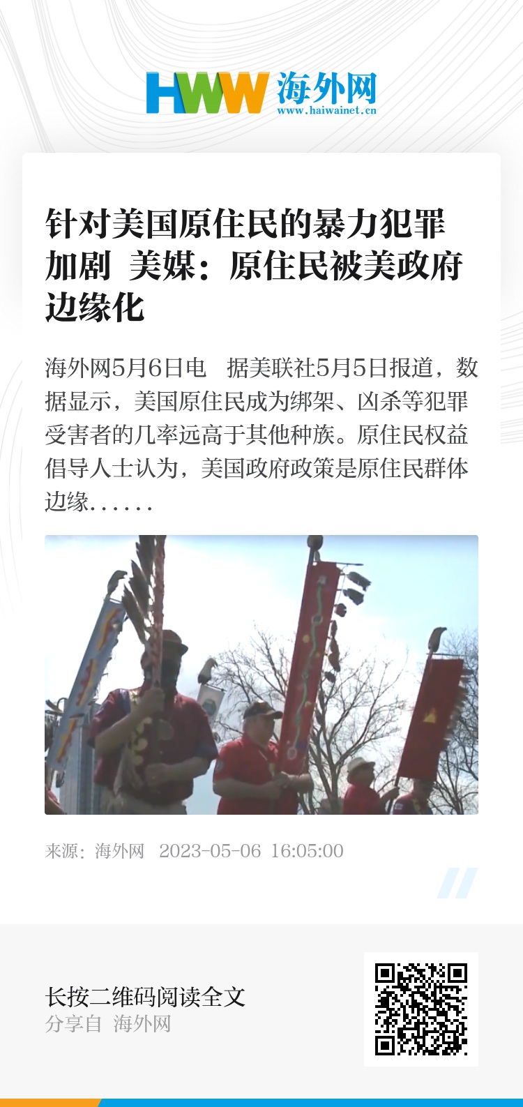 海外网5月6日电 据美联社5月5日报道,数据显示,美国原住民成为绑架、凶杀等犯罪受害者的几率远高于其他种族。原住民权益倡导人士认为,美国政府政策是原住民群体边缘化的一大主因。
