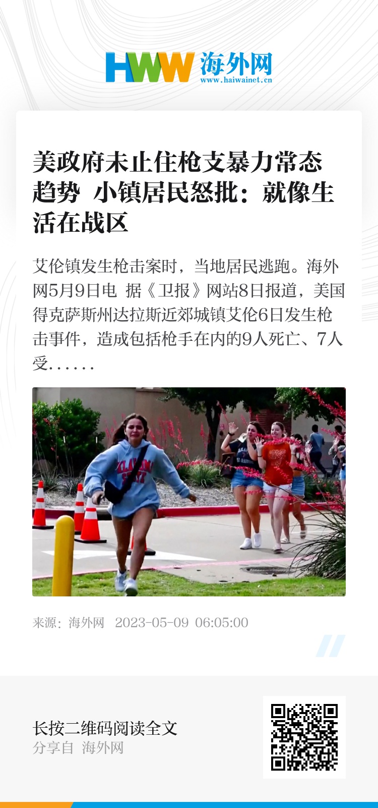 海外网5月9日电 据《卫报》网站8日报道,美国得克萨斯州达拉斯近郊城镇艾伦6日发生枪击事件,造成包括枪手在内的9人死亡、7人受伤。该镇居民劳伦·多尔蒂回忆起近些年小镇附近发生的大规模枪击事件,斥责政府并未对此做出改变,民众对枪支暴力常态已感到麻木,“就像生活在战区”一样。